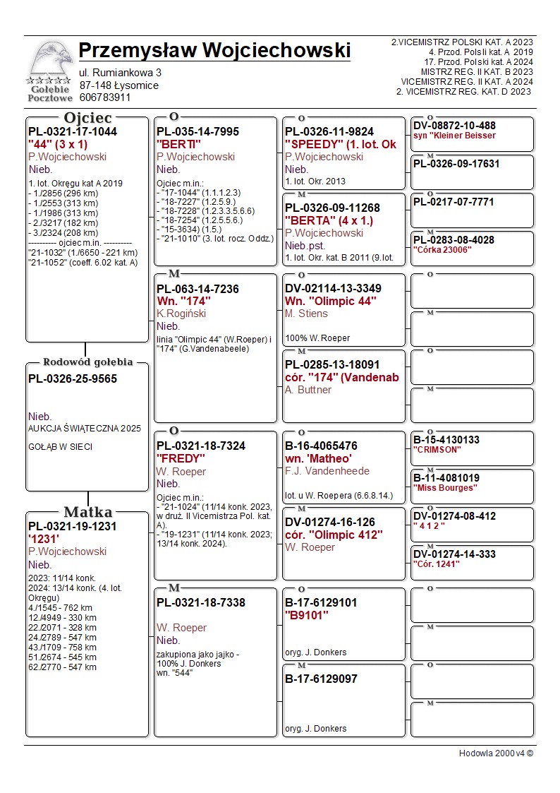 DZIECKO WYBITNEGO GOŁĘBIA HODOWLI “1044” - M.IN.: 1, 1, 1, 2, 3.. JEST ON OJCEM I DZIADKIEM WIELU LOTNIKÓW Z DRUŻYN KAT. A W OSTATNICH 3 SEZONACH M.IN.: II V-CE MISTRZ POLSKI 2023! | DZIECKO WSPANIAŁEJ LOTNICZKI “1231” - 4 AS OKRĘGU 2024 (13/14KONK) | WNUK ASA ROZPŁODU “BERTI 7995” - DZIECI M.IN.: 1, 1, 1, 1, 1, 1, 1, 2, 2, 2, 2, 3, 3, 3, 5, 5, 5, 5, 5, 6, 6, 6, 9.. !! | WNUK BAZOWEGO ROZPŁODOWCA FREDY 7324