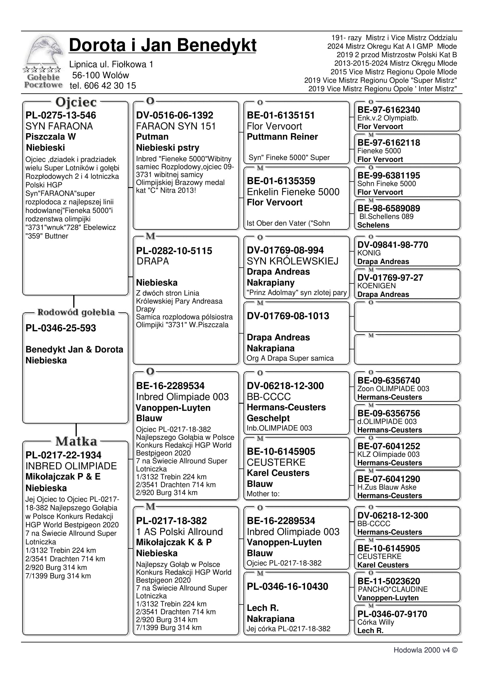 Hodowla z Oddziału 0346 Brzeg Dolny.191 - krotny Mistrz i Vice Mistrz oddziału Brzeg Dolny 32 - krotny Mistrz i Vice Mistrz Okręgu Wrocław Trzeci Zespół Lotników Polski HGP 2022 2 Przodownik Polski -…