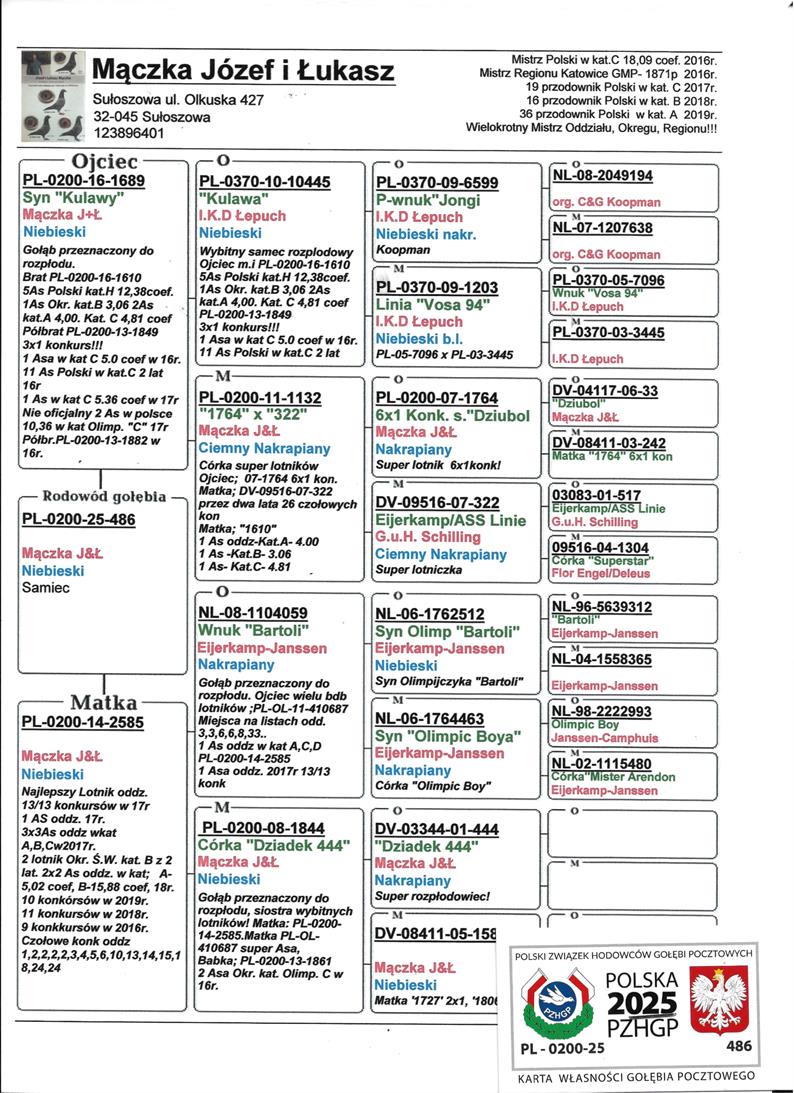 SYN WYBITNEJ SAMICY HODOWLI “LALUNIA 85” - ZDOBYŁA M.IN.: 1, 2, 2, 2, 2, 3, 4, 5, 6, 10, 13, 14, 15, 18.. / NAJLEPSZA LOTNICZKA ODDZIAŁU 2017 (13/13KONK) / 2 AS OKRĘGU KAT. SPORT B / 30KONK W 3 LATA | SYN ROZPŁODOWCA “1689" - PEŁNY BRAT SPRINT 10 - 5 AS POLSKI KAT. SPORT H 12,38 COEFF. !! | WNUK NAJLEPSZEGO GOŁĘBIA ROZPŁODOWEGO HODOWLI “KULAWA 10445” - OJCIEC I DZIADEK WIELU WSPANIAŁYCH LOTNIKÓW