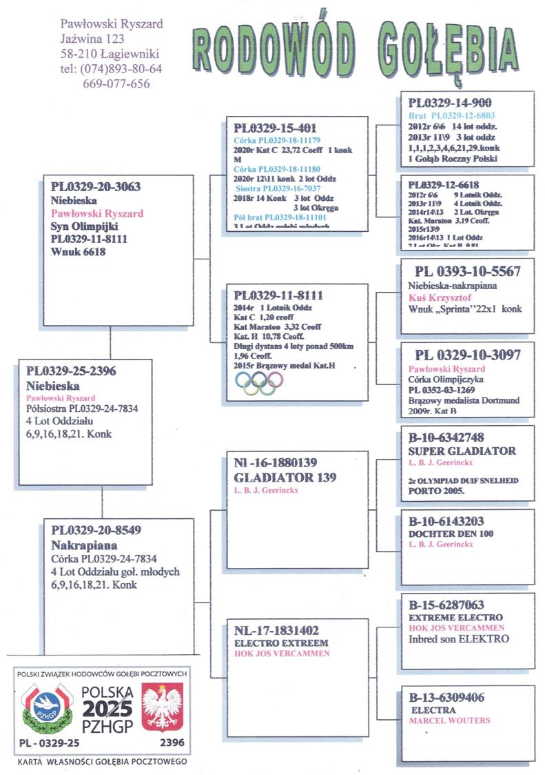 WNUK OLIMPIJKI "8111" -> 1 AS POLSKI KAT. SPORT H / BRĄZOWY MEDAL BUDAPESZT 2015 | DZIECKO SAMICY "8549" (LINIA "GLADIATOR" GEERINCKX) - JEST MATKĄ M.IN.: "7834" -> 4 MŁODY LOTNIK ODDZIAŁU 2024R - M.IN.: 6, 9, 16, 18, 21.. | DZIECKO ROZPŁODOWCA "3063" - INBRED PARY ROZPŁODOWEJ NR 1 "5567 X 3097" (CÓRKA X WNUK) | WNUK ROZPŁODOWCA "401" - SYN SUPER LOTNICZKI 6618 (CÓRKA PARY NR 1) -> 1 LOTNIK ODDZIAŁU 2016 (13/14KONK) / 2 LOTNIK OKRĘGU 2014 (13/14KONK.) /2017R (13/15KONK. - 2 X 1 KONK) !!