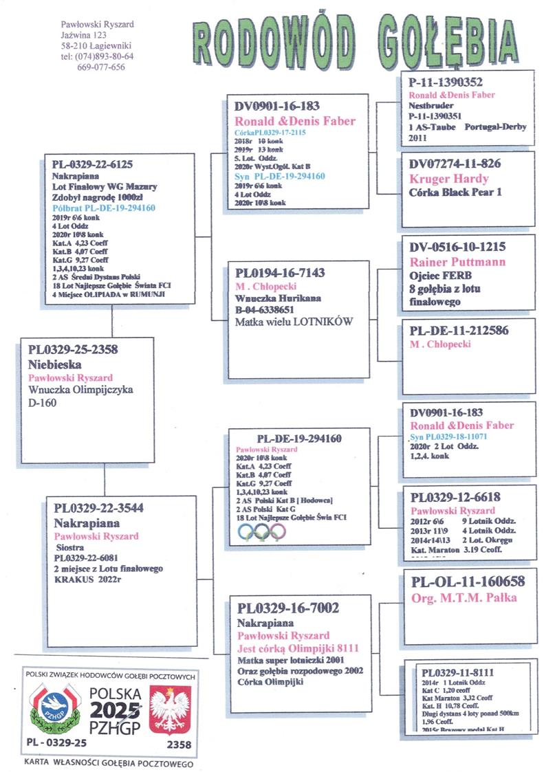 INBRED SUPER ROZPŁODOWCA "183" ORG. ROLAND & DENIS FABER (OJCIEC OLIMPIJCZYKA "294160" - KAT. SPORT G) - SYN X WNUCZKA !! | WNUK WSPANIAŁEGO LOTNIKA "294160" -> 2 AS POLSKI KAT. SPORT G 9,27 COEFF. / JAKO ROCZNY 8/10KONK. - KAT. A 4,23COEFF. -> KAT. B 4,07COEFF. M.IN.: 1, 3, 4, 10, 23.. | DZIECKO SAMICY ROZPŁODOWEJ "3544" -> PEŁNA SIOSTRA "6081" - 2 MIEJSCE Z LOTU FINAŁOWEGO WG KRAKUS 2022R !! | WNUK SUPER SAMICY ROZPŁODOWEJ "7002" - JEST ONA CÓRKĄ OLIMPIJKI "8111" - KAT. SPORT G