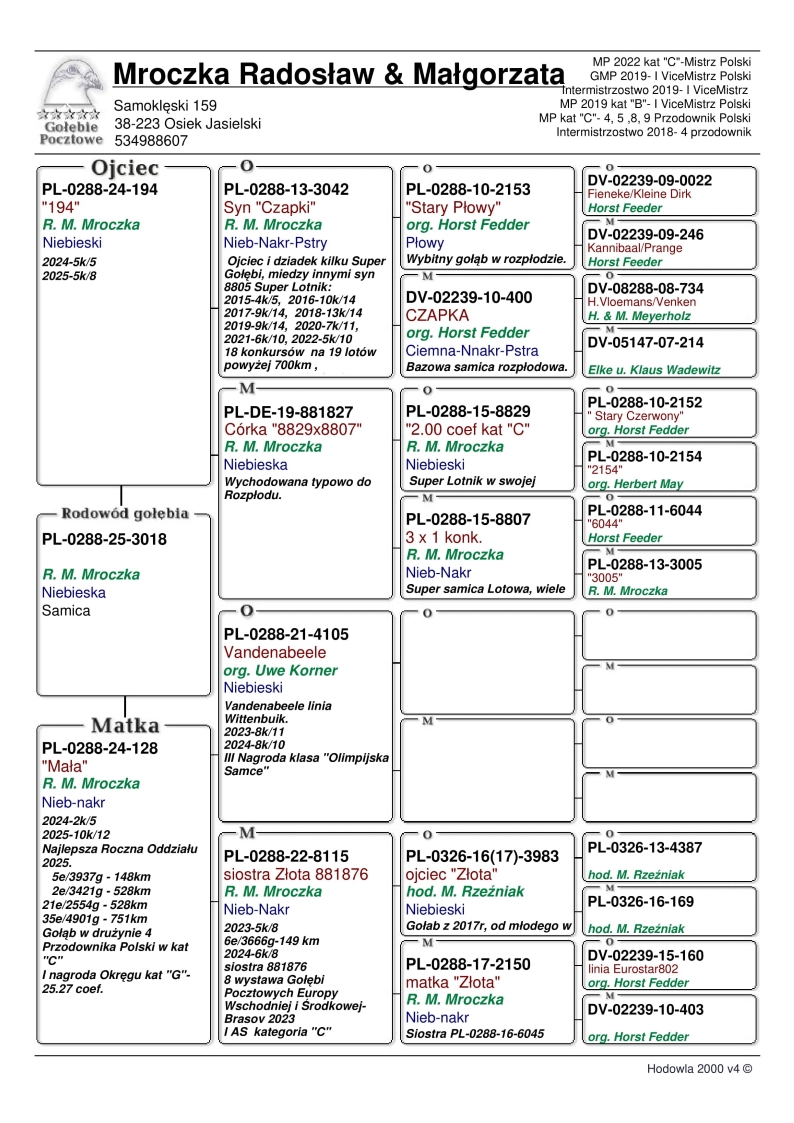 PÓŁSIOSTRA SUPER LOTNICZKI "5559" -> W SEZONIE 2024 ZDOBYŁA 13/14 KONK. (5796 K/KM) - W TYM LOT OKRĘGOWY 921KM | CÓRKA SUPER ROZPŁODOWCA "12176" - JEST ON BRATEM MATKI "881876" - ZŁOTY MEDAL BRASOV 2023 KAT. SPORT C / 1 AS POLSKI KAT. C - 10,083COEFF. | WNUCZKA SUPER LOTNICZKI "2298" -> 2 AS …
