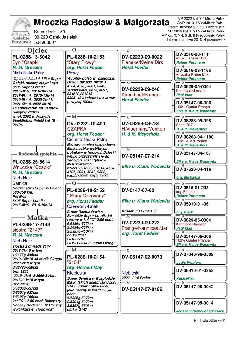Hodowla z Oddziału 0288 Jasło. Do każdego gołębia dodany został filmik z prezentacją. Mistrzowie Polski 2022r - kat. CI v-ce Mistrzowie Polski 2019r - kat. BI v-ce Mistrzowie Polski 2019r - kat. Generalne…
