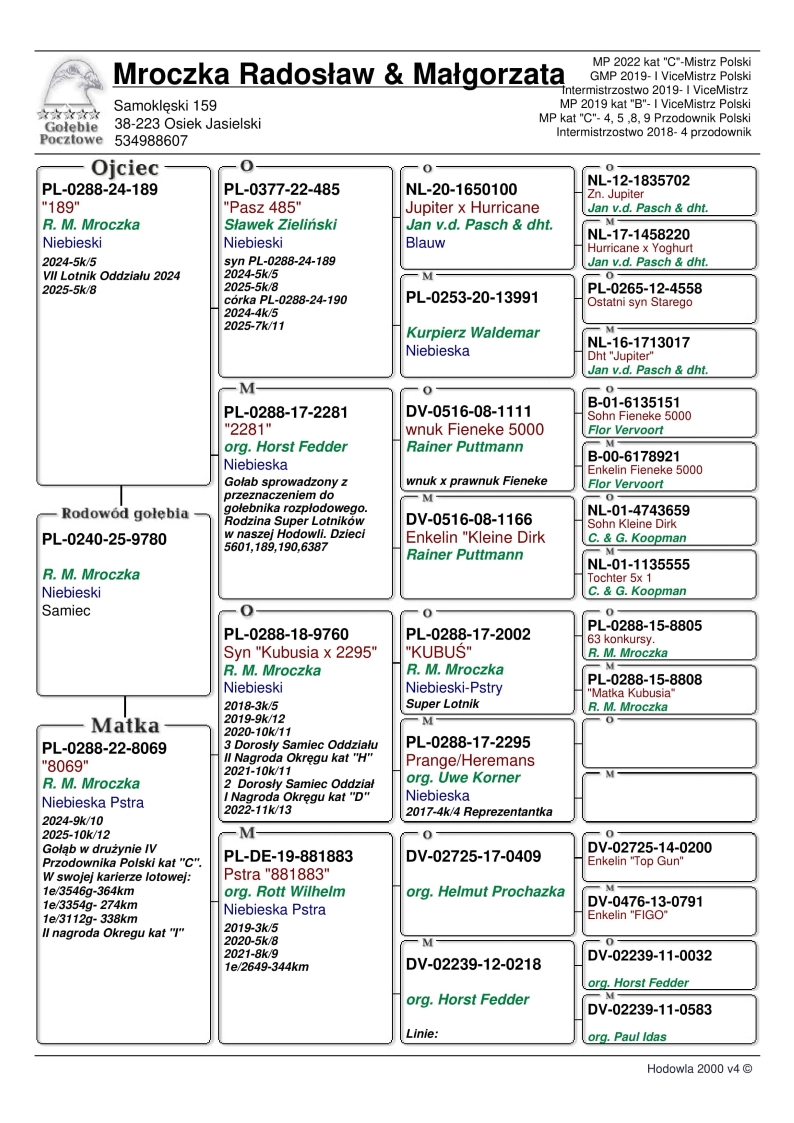 SYN SUPER LOTNICZKI 8069 (WNUCZKA KUBUSIA I 2295) → W DRUŻYNIE 4 PRZODOWNIKA POLSKI 2025 KAT. C / W SEZONIE 2025 ZDOBYŁA 10 / 12 KONK. / W 2024R - 9 / 10KONK. / ZDOBYŁA M.IN.: 3X PIERWSZY KONKURS: 1/ 3546 SZT - 364KM / 1/ 3354SZT - 274KM / 1/ 3112SZT - 338KM / 2 AS OKRĘGU RZESZÓW KAT. SPORT I | SYN ROCZNEGO LOTNIKA 189 → JAKO MLODY W SEZONIE 2024 ZDOBYŁ 5/5 KONK. (7 LOTNIK ODDZIAŁU)