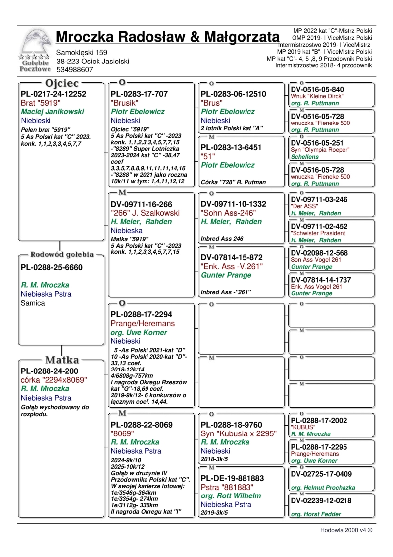 SYN SUPER LOTNICZKI 8069 (WNUCZKA KUBUSIA I 2295) → W DRUŻYNIE 4 PRZODOWNIKA POLSKI 2025 KAT. C / W SEZONIE 2025 ZDOBYŁA 10 / 12 KONK. / W 2024R - 9 / 10KONK. / ZDOBYŁA M.IN.: 3X PIERWSZY KONKURS: 1/ 3546 SZT - 364KM / 1/ 3354SZT - 274KM / 1/ 3112SZT - 338KM / 2 AS OKRĘGU RZESZÓW KAT. SPORT I | SY …