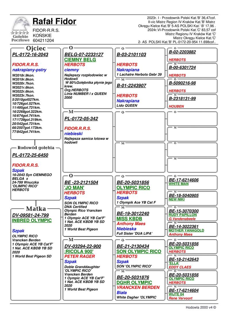 DZIECKO BARDZO DOBREGO LOTNIKA “2043” → ZDOBYŁ M.IN.: 5, 10, 11, 16, 16, 17, 20.. / W LATACH 2018-2023 ZDOBYŁ 43 KONK. | WNUK NAJLEPSZEGO GOŁĘBIA ROZPŁODOWEGO HODOWLI “CIEMNY BELG” ORG. HERBOTS | DZIECKO SAMICY ROZPŁODOWEJ “799” - INBRED/WNUCZKA “OLYMPIC RICO” GEBR. HERBOTS - 1 OLYMPIC ACE YB CAT. SPORT F / 1 NAT. ACE KBDB YB SD 2020 (WYHODOWANA Z PAROWANIA SYN X PODWÓJNA WNUCZKA)