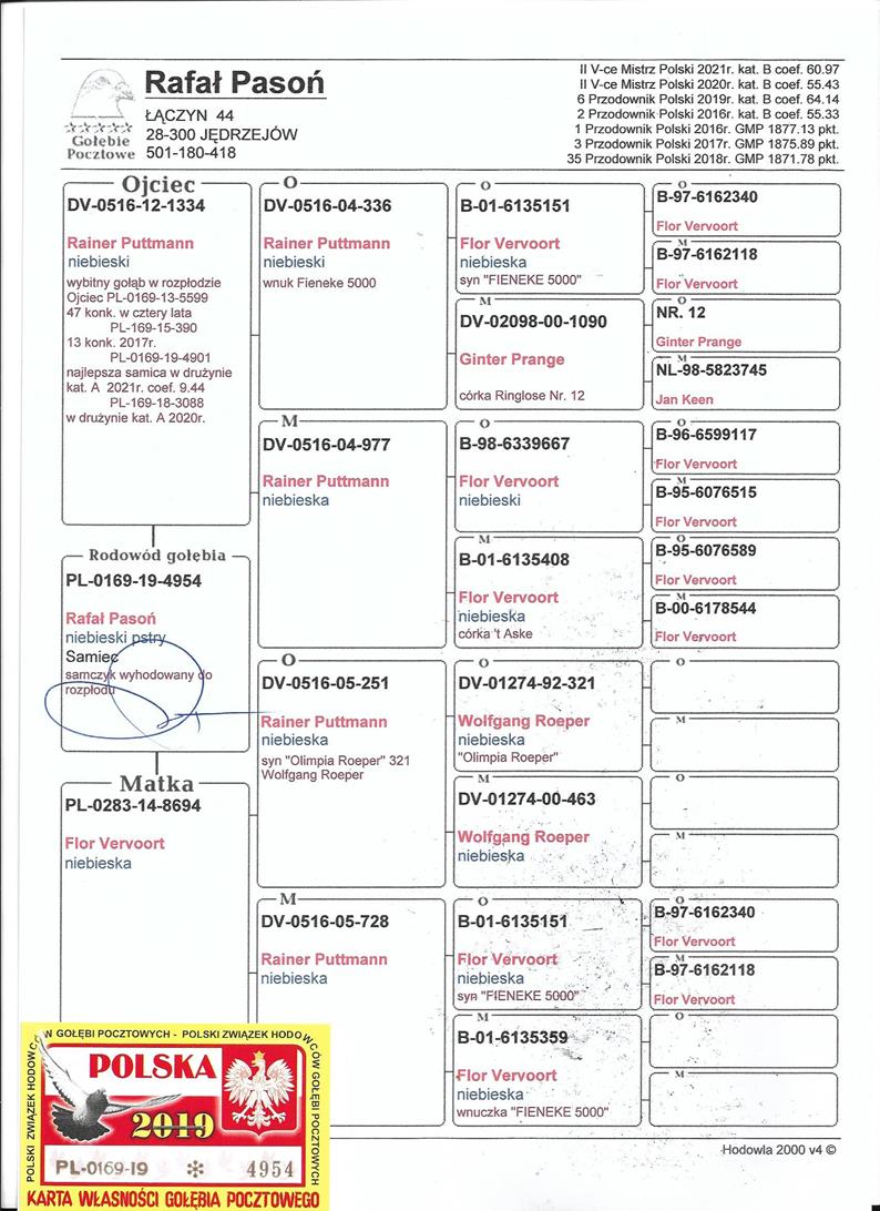 SYN WSPANIAŁEGO ROZPŁODOWCA “FIENEKE 1334” - OJCIEC WYBITNYCH LOTNIKÓW HODOWLI M.IN.: “13-5599” - 47KONK W 4 LATA! / “15-390” - W 2017R (13 KONK.) / “19-4901” - NAJLEPSZA W DRUŻYNIE KAT. A 2021 - 9,44 COEFF. | WNUK SUPER ROZPŁODOWCA “251” ORG. RAINER PUTTMANN - SYN “OLIMPIA ROEPER 321” ORG. WOLFGANG ROEPER !! | SYN SUPER SAMICY “8694” (W. ROEPER X FLOR VERVOORT)