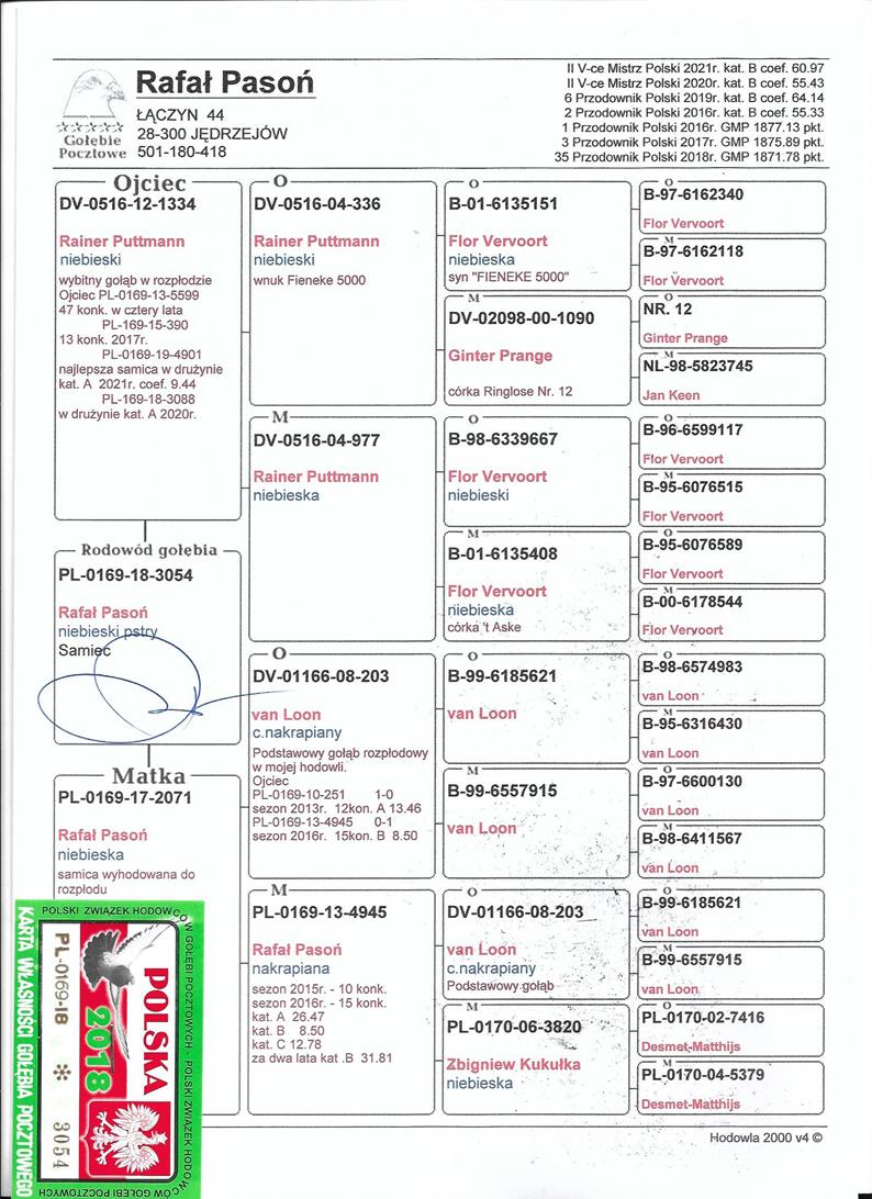 SYN WSPANIAŁEJ LOTNICZKI “2002” (CÓRKA VAN LOON 203) - W DRUŻYNIE II V-CE MISTRZA POLSKI 2020R - KAT. B 12,06 COEFF. | WNUK BAZOWEGO GOŁĘBIA HODOWLI “VAN LOON 203” - OJCIEC, DZIADEK I PRADZIADEK WIELU WSPANIAŁYCH LOTNIKÓW I GOŁĘBI ROZPŁODOWYCH W HODOWLI M.IN.: “13-4945” - SEZON 2016 (15 KONK.) KAT …