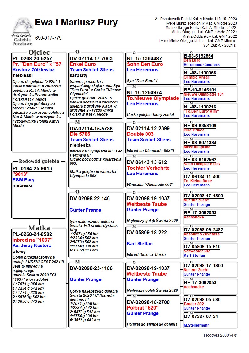 DZIECKO SAMICY ROZPŁODOWEJ "8582" ORG. KS. JERZY KOSTORZ - INBRED WSPANIAŁEGO LOTNIKA "1037" G. PRANGE (SYN X CÓRKA) - NAJLEPSZY GOŁĄB ŚWIATA FCI - KAT. ŚREDNI DYSTANS / ZDOBYŁ M.IN.: 1, 1, 1, 2, 6.. !! | DZIECKO SUPER ROZPŁODOWCA "5257" (LEO HEREMANS - DEN EURO / OLYMPIADE 003) - JEST OJCEM M.IN.: "2025" - 1 MŁODY LOTNIK ODDZIAŁU 2023 / NAJLEPSZY GOŁĄB W DRUŻYNIE 2 PRZODOWNIKA POLSKI KAT. A MŁODE 2023