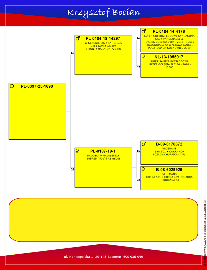 DZIECKO NAJLEPSZEGO GOŁĘBIA LOTOWEGO HODOWLI "14297" (WNUK "JASON" G. VANDENABEELE) - W JEDNYM SEZONIE SAMCZYK TEN ZDOBYŁ 3 X PIERWSZY KONKURS! / M.IN.: 2X 1KONKURS Z 520KM. / 1KONK. Z MARATONU 720KM. - KAT. C - 1,06COEFF. | DZIECKO SAMICY ROZPŁODOWEJ “JEDYNKA” ORG. RADOSŁAW MAŁOLEPSZY (100% VLOEMANS) - INBRED “501” - 6 ASA BELGII (LINIA "HURRICAN 51)