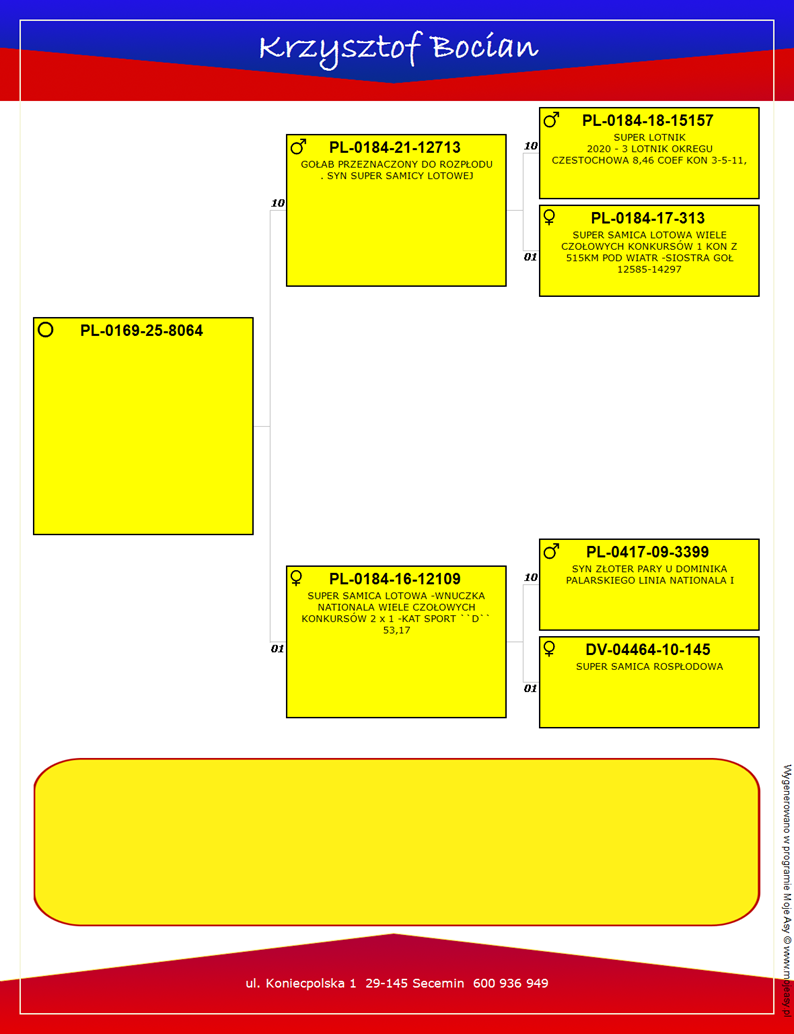 SYN SUPER LOTNICZKI "12109" (LINIA "NATIONAL 1" SCHELLENS) - 3 AS OKRĘGU KIELCE 2018 KAT. SPORT D / ZDOBYŁA M.IN.: 1/ 326KM / 1/ 715KM - PRĘDKOŚC 1123M/MIN! / 3/ 539KM !! | WNUK WSPANIAŁEJ LOTNICZKI "17-313" - 13 AS POLSKI KAT. SPORT D (KATOWICE 2022R) - JEST ONA CÓRKĄ BAZOWEGO 4176 I SIOSTRA “14297” (3X 1 KONK. KAT. C - 1,06) ORAZ “12585” - 7 AS POLSKI KAT. SPORT H (KATOWICE 2019R) | WNUK SUPER LOTNIKA "15157" - 3 LOTNIK OKRĘGU CZĘSTOCHOWA 2020R - KAT. B - 8,46COEFF.