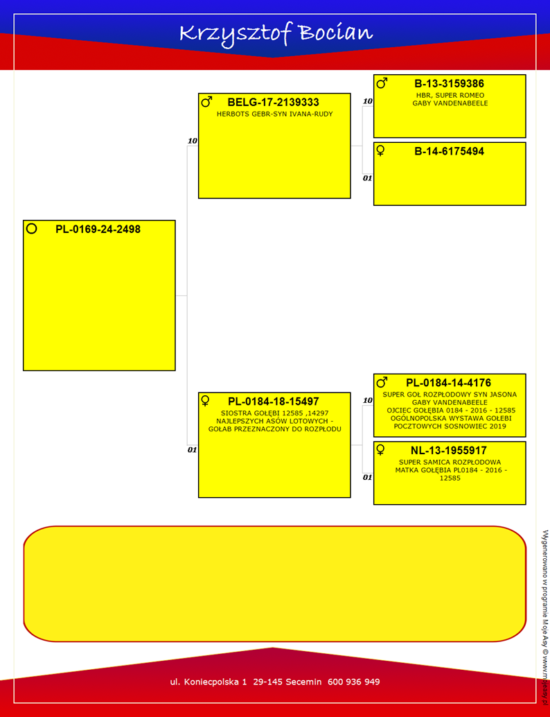 WNUK ROZPŁODOWCA NR 1 HODOWLI “4176” (SYN “JAOSN” GABY VANDENABEELE) - OJCIEC WYBITYNCH LOTNIKÓW HODOWLI M.IN.: "14297" - W 2022R SAMCZYK TEN ZDOBYŁ 3 X PIERWSZY KONKURS! / M.IN.: 2X 1KONKURS Z 520KM. / 1KONK. Z MARATONU 720KM. - KAT. C - 1,06COEFF. / "17-313" - 13 AS POLSKI KAT. SPORT D (KATOWICE 2022R) / "12585" - 7 AS POLSKI KAT. SPORT H (KATOWICE 2019R)