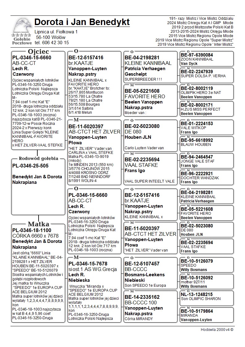 SYN / INBRED NAJLEPSZEGO SAMCA ROZPŁODOWEGO HODOWLI “CZERWONY 6660” (WNUK KLEINE KANNIBAAL) - OJCIEC I DZIADEK WSPANIAŁYCH LOTNIKÓW M.IN.: CÓRKA “PŁOWA 3250” - 2 LOTNICZKA POLSKI / 1 AS OKRĘGU KAT. SPORT E (MARATON) / 2 DOROSŁA LOTNICZKA ODDZIAŁU 2018 | SYN SAMICY ROZPŁODOWEJ “1100” - CÓRKA NAJLEPSZEJ PARY HODOWLI “CZERWONY 6660” X “7678” - JEJ DZIECI M.IN.: 1, 1, 1, 1, 1, 2, 3, 4, 4, 4, 7, 8, 8, 9, 9, 9..