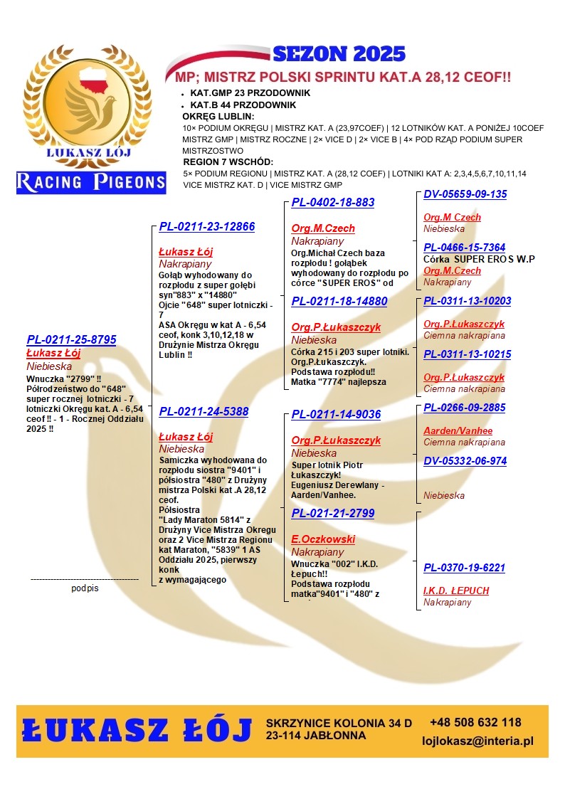 PÓŁBRAT SUPER LOTNIKA ‘641’ → 4 LOTNIK OKRĘGU LUBLIN 2025 - KAT. A 4,68 COEFF. / PÓŁBRAT “437” - W DRUŻYNIE II V-CE MISTRZA OKRĘGU 2025 KAT. B | SYN SUPER ROZPŁODOWCA “MAŁY MARCIN 14428” ORG. M. KAPINOS & G. LEŚ → JEST ON SYNEM “NEW STAR 4888” / WYDAŁ M.IN.: 4 ASA OKRĘGU 2025 KAT. A | SYN SUPE …