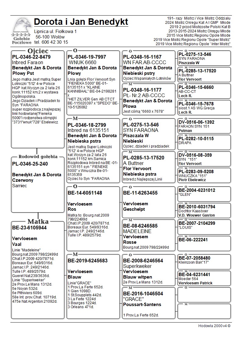MŁODY LOTNIK ‘240’ | WNUK SUPER SAMICY ROZPŁODOWEJ “2799” (CÓRKA BAZOWEGO FARAONA 546) - JEST ONA MATKĄ M.IN.: “512" → 4 LOTNICZKA POLSKI HGP / KAT. WYCZYN ZA 2 LATA - 11 152K/KM!! | SYN ROZPŁODOWCA “8479” → INBRED/WNUK BAZOWEGO SAMCA HODOWLI “FARAON 546” | SYN SAMICY “6105944” ORG. VERVLOESEM - WNUCZKA “MADELEINE” / WNUCZKA BAZOWEGO SAMCA “SUPERKWEKER 564” ORG VERVLOESEM