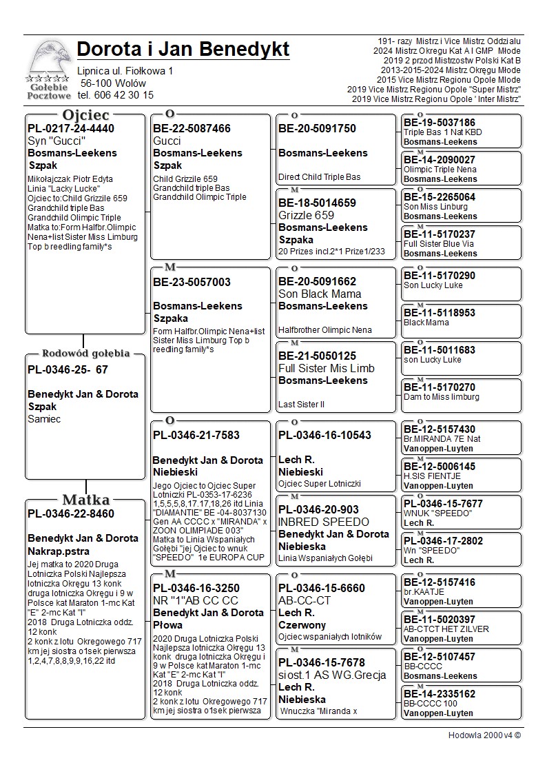 Hodowla z Oddziału 0346 Brzeg Dolny.191 - krotny Mistrz i Vice Mistrz oddziału Brzeg Dolny 32 - krotny Mistrz i Vice Mistrz Okręgu Wrocław Trzeci Zespół Lotników Polski HGP 2022 2 Przodownik Polski -…