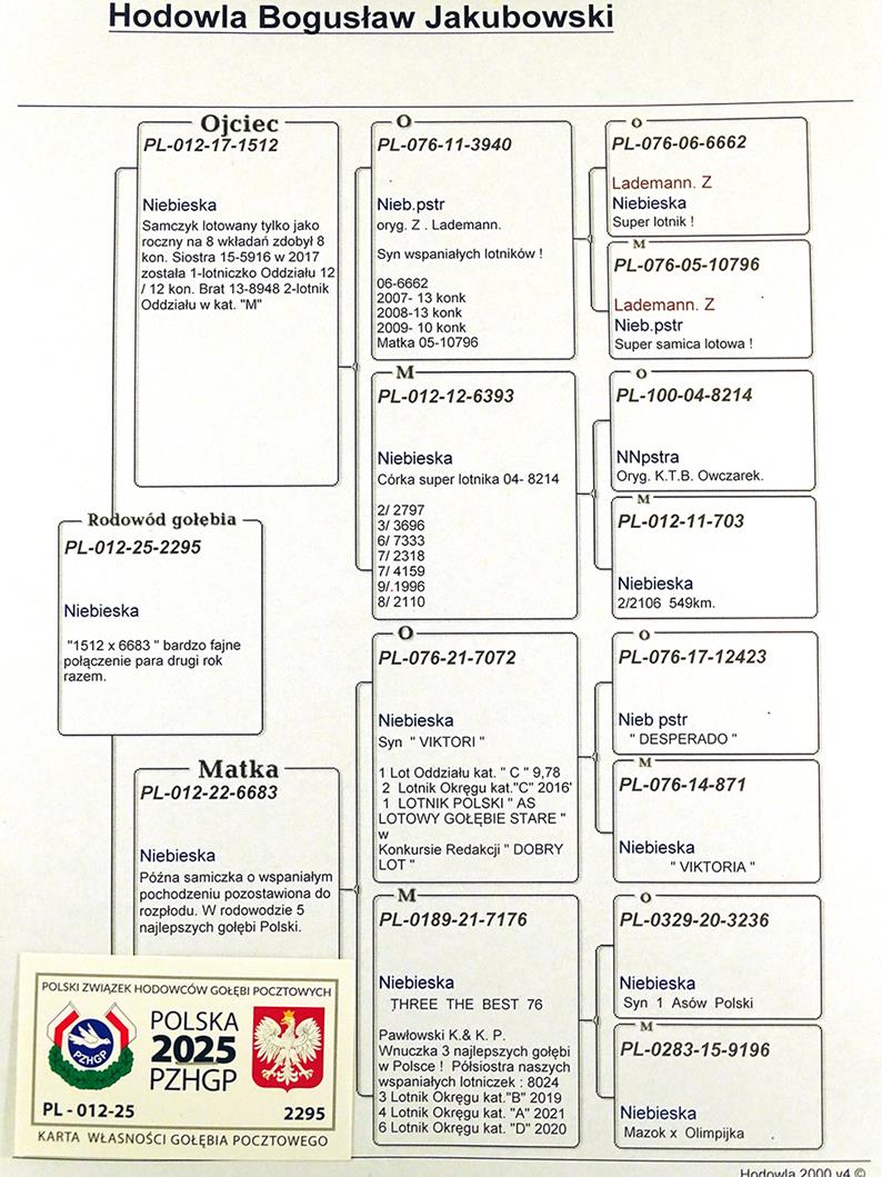 INBRED SUPER LOTNIKA I ROZPŁODOWCA '2152" ORG. RYSZARD PAWŁOWSKI (SYN X WNUCZKA) - 1 AS POLSKI ALLROUND / 2 AS POLSKI KAT. DŁUGI DYSTANS / 1 LOTNIK ODDZIAŁU 2019R - 14/15 KONK. / 1 LOTNIK OKRĘGU WAŁBRZYCH 2019 | CÓRKA SAMICY ROZPŁODOWEJ "7176" ORG. PAWŁOWSKI K. & K. P. - JEST ONA WNUCZKĄ TRZEC …