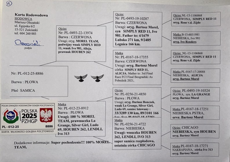100% MOREL TEAM - WNUK SAMCA ROZPŁODOWEGO “13801" ORG. MOREL TEAM (WNUK ‘WITTEKOPEK’) - JEST ON M.IN. OJCEM NAJLEPSZEGO MŁODEGO LOTNIKA ODDZIAŁU BIAŁYSTOK KAT. A | WNUK SAMICY ROZPŁODOWEJ “20180” ORG. KRYSTIAN NOWAK (100% MOREL TEAM) - WNUCZKA “MUSK” / “BETTI” / “CZAPI” | SYN SAMICY ROZPŁODOWEJ “6 …