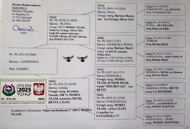 100% MOREL TEAM - WNUK SAMCA ROZPŁODOWEGO “13801" ORG. MOREL TEAM (WNUK ‘WITTEKOPEK’) - JEST ON M.IN. OJCEM NAJLEPSZEGO MŁODEGO LOTNIKA ODDZIAŁU BIAŁYSTOK KAT. A | WNUK SAMICY ROZPŁODOWEJ “20180” ORG. KRYSTIAN NOWAK (100% MOREL TEAM) - WNUCZKA “MUSK” / “BETTI” / “CZAPI” | SYN SAMICY ROZPŁODOWEJ “6 …