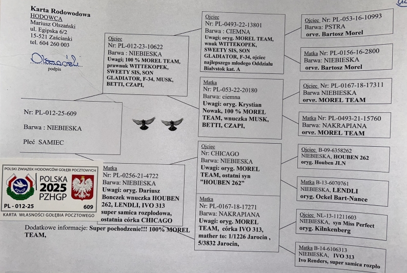 100% MOREL TEAM - WNUK SAMCA ROZPŁODOWEGO “13801" ORG. MOREL TEAM (WNUK ‘WITTEKOPEK’) - JEST ON M.IN. OJCEM NAJLEPSZEGO MŁODEGO LOTNIKA ODDZIAŁU BIAŁYSTOK KAT. A | WNUK SAMICY ROZPŁODOWEJ “20180” ORG. KRYSTIAN NOWAK (100% MOREL TEAM) - WNUCZKA “MUSK” / “BETTI” / “CZAPI” | SYN SAMICY ROZPŁODOWEJ “6 …