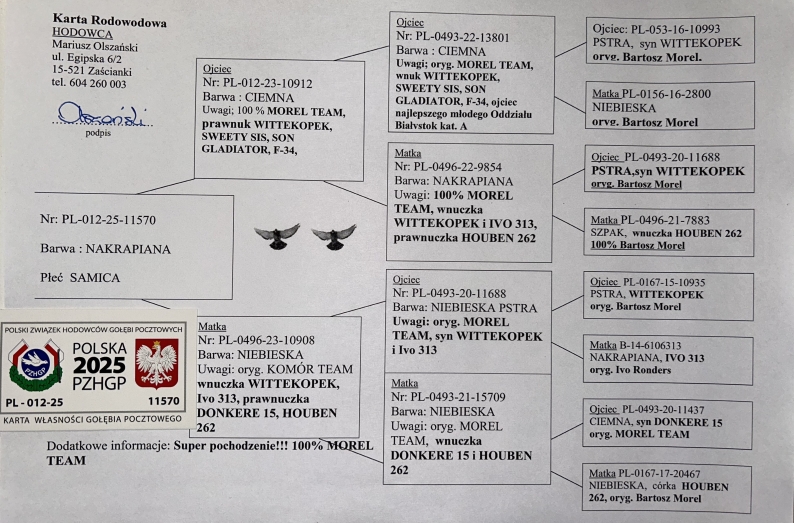 100% MOREL TEAM - WNUK SAMCA ROZPŁODOWEGO “13801" ORG. MOREL TEAM (WNUK ‘WITTEKOPEK’) - JEST ON M.IN. OJCEM NAJLEPSZEGO MŁODEGO LOTNIKA ODDZIAŁU BIAŁYSTOK KAT. A | WNUK SAMICY ROZPŁODOWEJ “20180” ORG. KRYSTIAN NOWAK (100% MOREL TEAM) - WNUCZKA “MUSK” / “BETTI” / “CZAPI” | SYN SAMICY ROZPŁODOWEJ “6 …