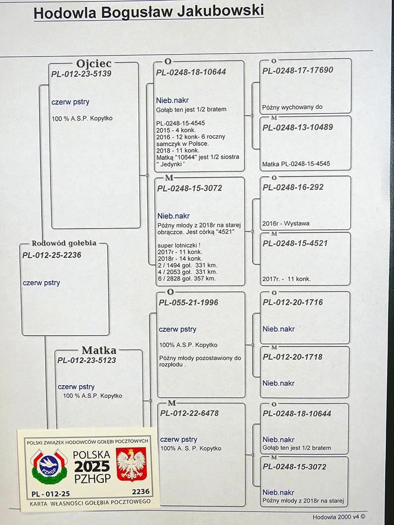 INBRED SUPER LOTNIKA I ROZPŁODOWCA '2152" ORG. RYSZARD PAWŁOWSKI (SYN X WNUCZKA) - 1 AS POLSKI ALLROUND / 2 AS POLSKI KAT. DŁUGI DYSTANS / 1 LOTNIK ODDZIAŁU 2019R - 14/15 KONK. / 1 LOTNIK OKRĘGU WAŁBRZYCH 2019 | CÓRKA SAMICY ROZPŁODOWEJ "7176" ORG. PAWŁOWSKI K. & K. P. - JEST ONA WNUCZKĄ TRZEC …