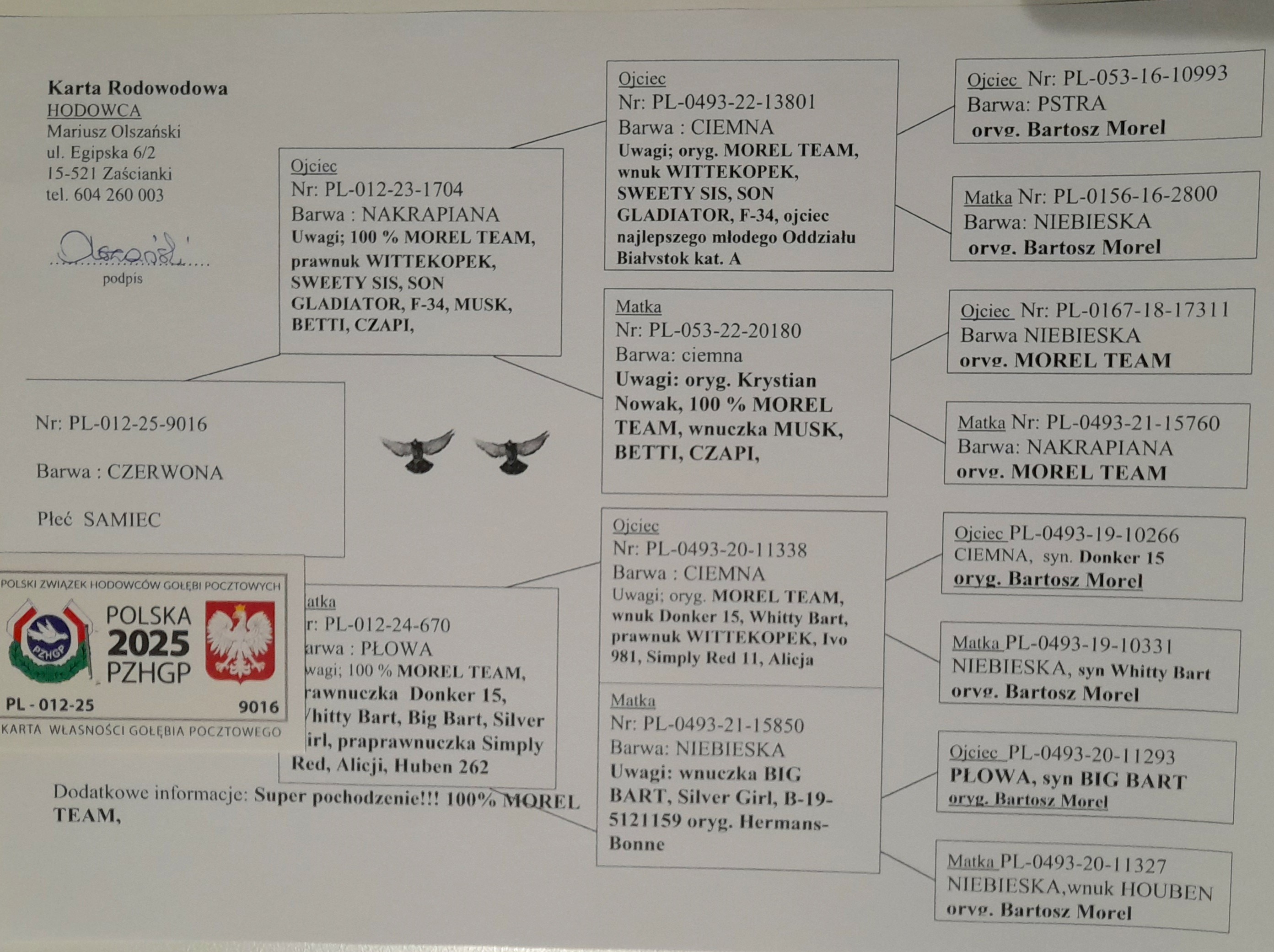 100% MOREL TEAM - WNUK SAMCA ROZPŁODOWEGO “13801" ORG. MOREL TEAM (WNUK ‘WITTEKOPEK’) - JEST ON M.IN. OJCEM NAJLEPSZEGO MŁODEGO LOTNIKA ODDZIAŁU BIAŁYSTOK KAT. A | WNUK SAMICY ROZPŁODOWEJ “20180” ORG. KRYSTIAN NOWAK (100% MOREL TEAM) - WNUCZKA “MUSK” / “BETTI” / “CZAPI” | SYN SAMICY ROZPŁODOWEJ “670” → PRAWNUCZKA “DONKER 15” / “WHITTY BART” / “ALICJA” / “SIMPLY RED”