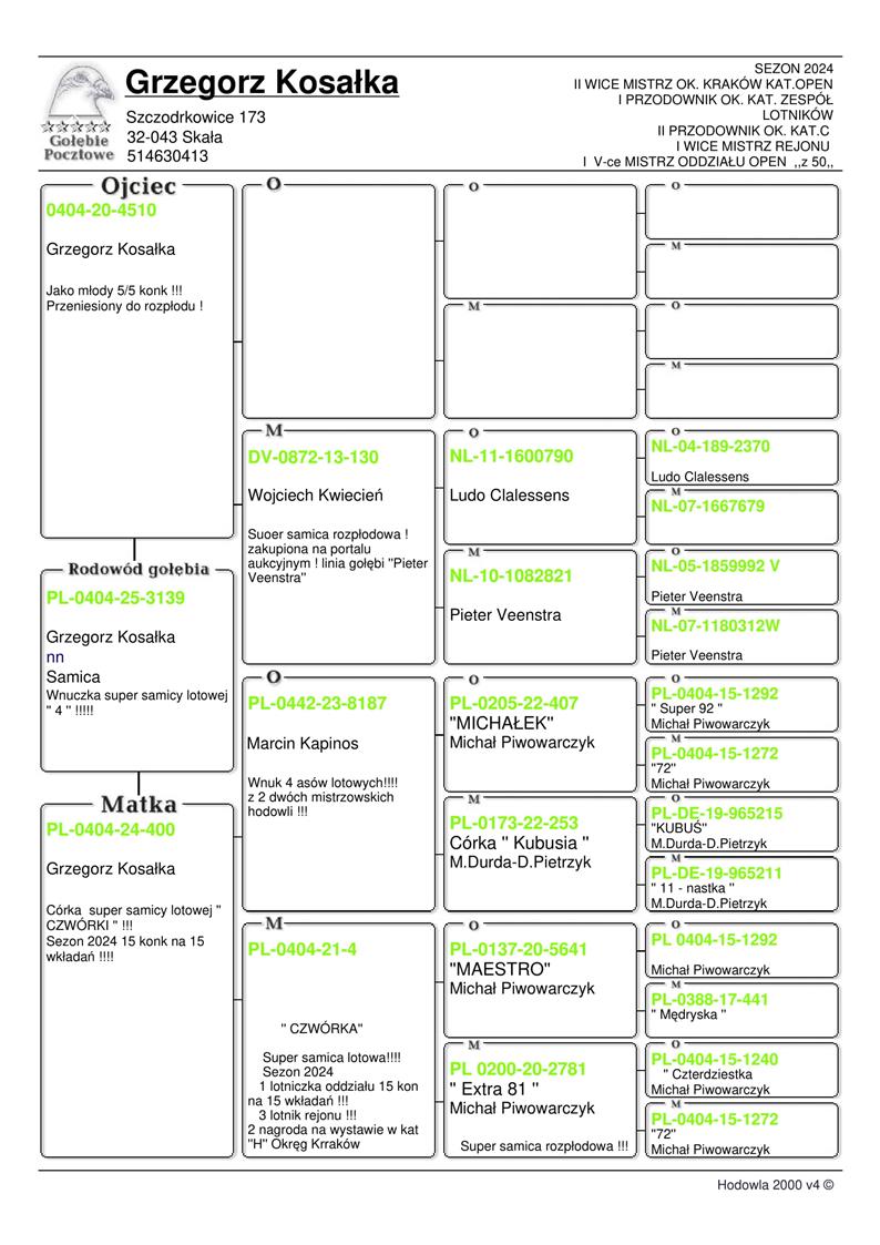 WNUCZKA WYBITNEJ LOTNICZKI HODOWLI ‘CZWÓRKA’ → - 15/15 KONKURSÓW W SEZONIE 2024 (W TYM M.IN.: 1, 3, 7, 8, 8..) / NAJLEPSZA LOTNICZKA ODDZIAŁU 2024R / 2 AS OKRĘGU KRAKÓW KAT. SPORT H / 3 AS REJONU LOTOWEGO (4 ODDZIAŁY) / 1 AS ODDZIAŁU 2024 KAT. C ! | CÓRKA SAMCZYKA “4510” → JAKO MŁODY ZDOBYŁ 5/5KONK. (PRZENIESIONY DO ROZPŁODU) | CÓRKA SAMICY “400” (CÓRKA ‘CZWÓRKI’) - OD STRONY OJCA I MATKI WYWODZI SIĘ Z POKREWIEŃSTWA DWÓCH WSPANIAŁYCH LOTNIKÓW I GOŁĘBI ROZPŁODOWYCH MICHAŁA PIWOWARCZYKA “1292 X 1272” !!