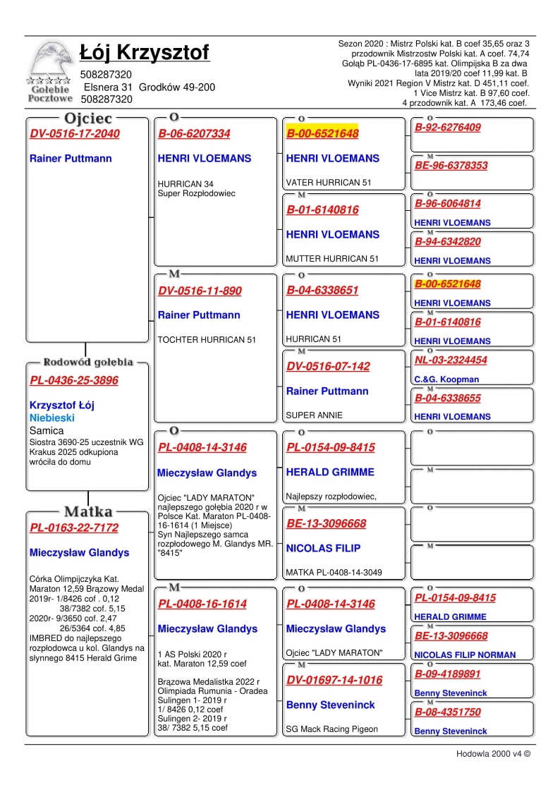 Hodowla z Oddziału 0436 Grodków II. Hodowla, która od wielu lat osiąga bardzo dobre wyniki, szczególnie na krótkim i średnim dystansie. Mistrz Polski w kategorii B w sezonie 2020! Najlepszy gołąb Polski…