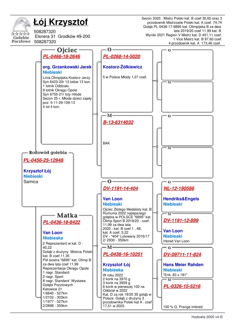 Hodowla z Oddziału 0436 Grodków II. Hodowla, która od wielu lat osiąga bardzo dobre wyniki, szczególnie na krótkim i średnim dystansie. Mistrz Polski w kategorii B w sezonie 2020! Najlepszy gołąb Polski…