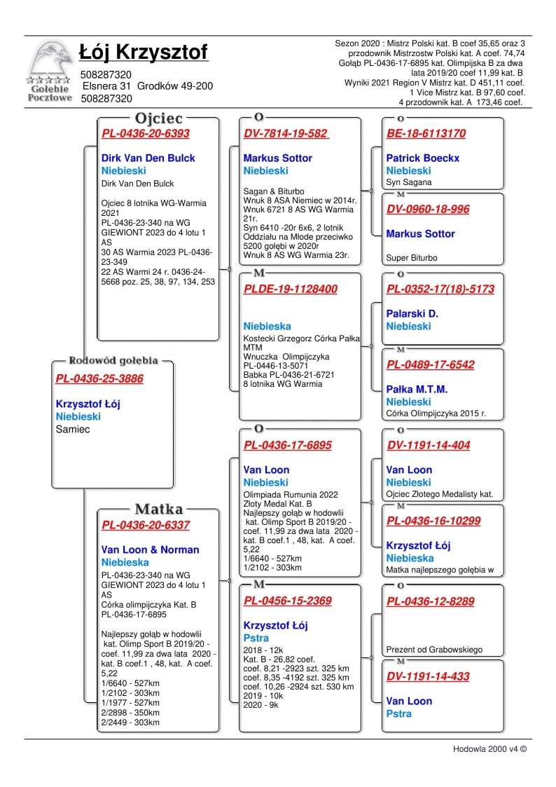 Hodowla z Oddziału 0436 Grodków II. Hodowla, która od wielu lat osiąga bardzo dobre wyniki, szczególnie na krótkim i średnim dystansie. Mistrz Polski w kategorii B w sezonie 2020! Najlepszy gołąb Polski…