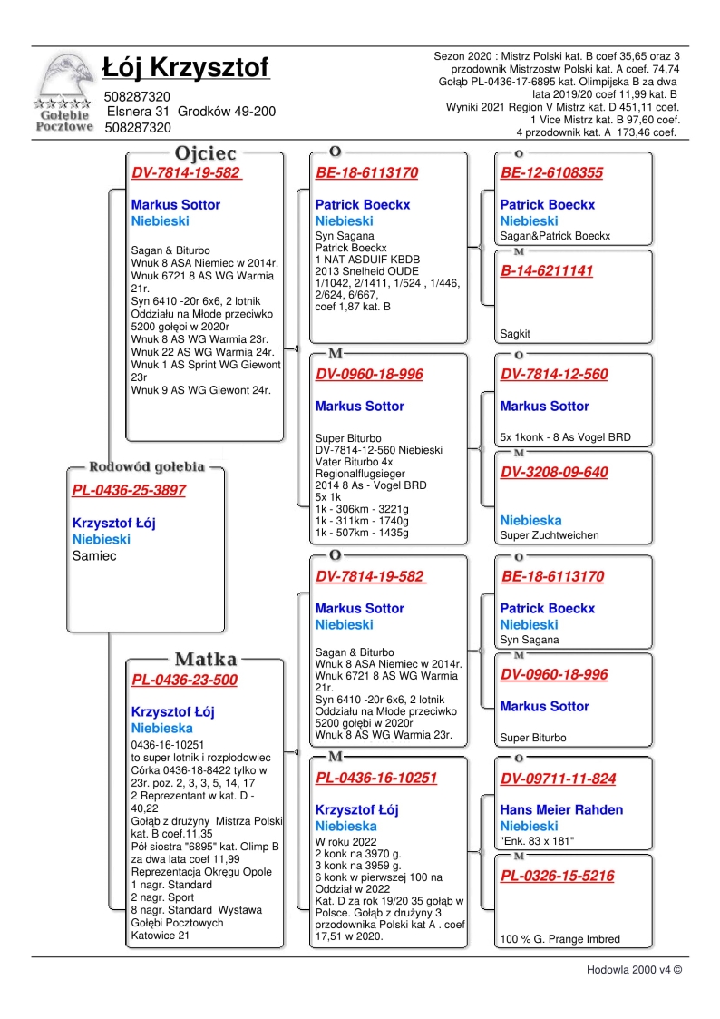 Hodowla z Oddziału 0436 Grodków II. Hodowla, która od wielu lat osiąga bardzo dobre wyniki, szczególnie na krótkim i średnim dystansie. Mistrz Polski w kategorii B w sezonie 2020! Najlepszy gołąb Polski…