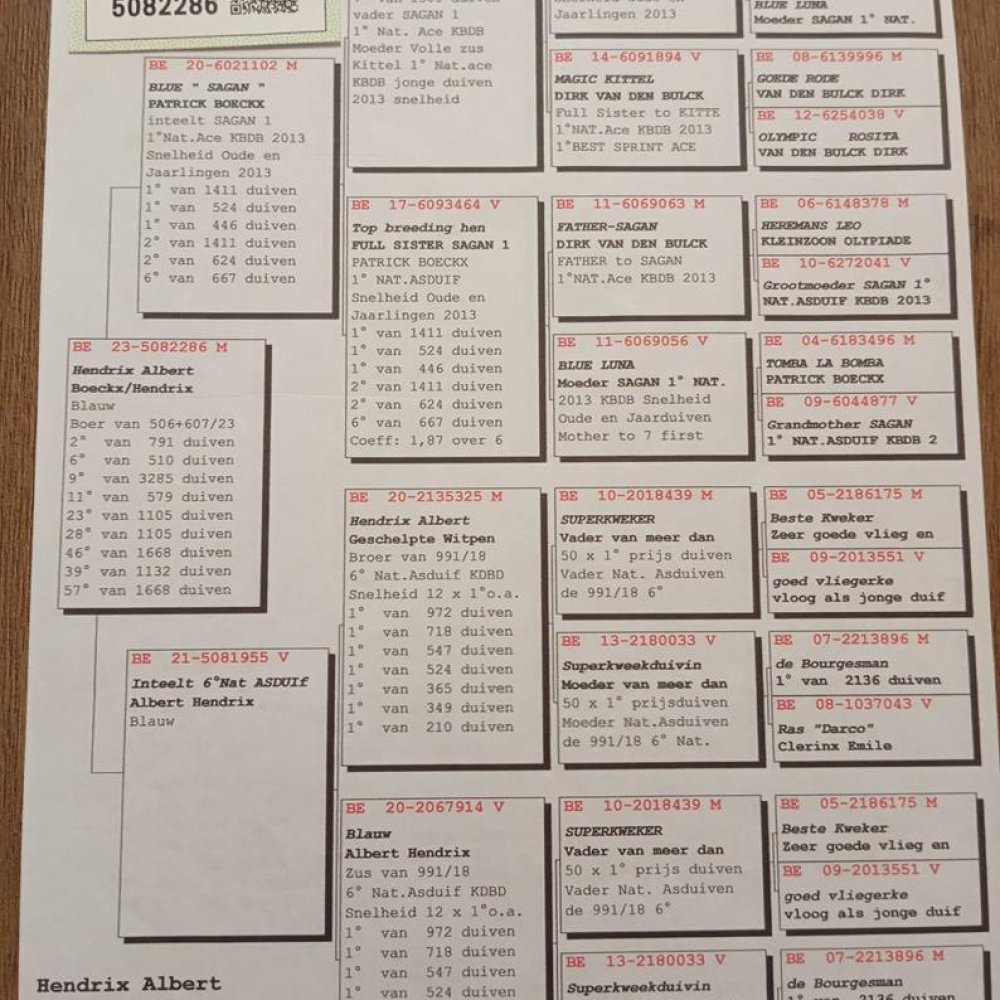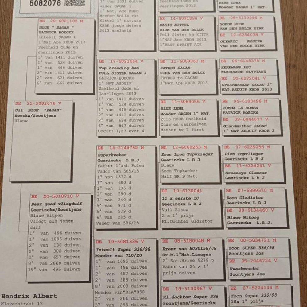 GOŁĄB WYHODOWANY W POKREWIEŃSTWIE SŁYNNEGO “SAGAN” PATRICK BOECKX - 1 NAT. ASDUIF SNELFEID OUDE EN JAARINGENG 2013 M.IN.: 1, 1, 1, 2, 2, 6.. !! | PODWÓJNY WNUK ROZPŁODOWCA “6021102” ORG. PATRICK BOECKX (INBRED SAGAN - Z PAROWANIA SYN ‘SAGANA’ X BAZOWA SAMICA ROZPŁODOWA 6093464 - PEŁNA SIOSTRA 'SAGANA") | WNUK “5081955” HENDRIX ALBERT - INBRED “991" 6 NAT. ASDUIF KBDB