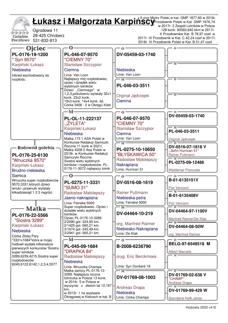 Hodowla z Oddziału 0176 Pińczów, która oparta jest na dwóch BAZOWYCH parach rozpłodowych: Para nr 1 - “CIEMNY 9570 x HURRICANKA 10650” Para nr 2 - “SUMO 3331 x DRAPKA 1684” Do każdego gołębia…