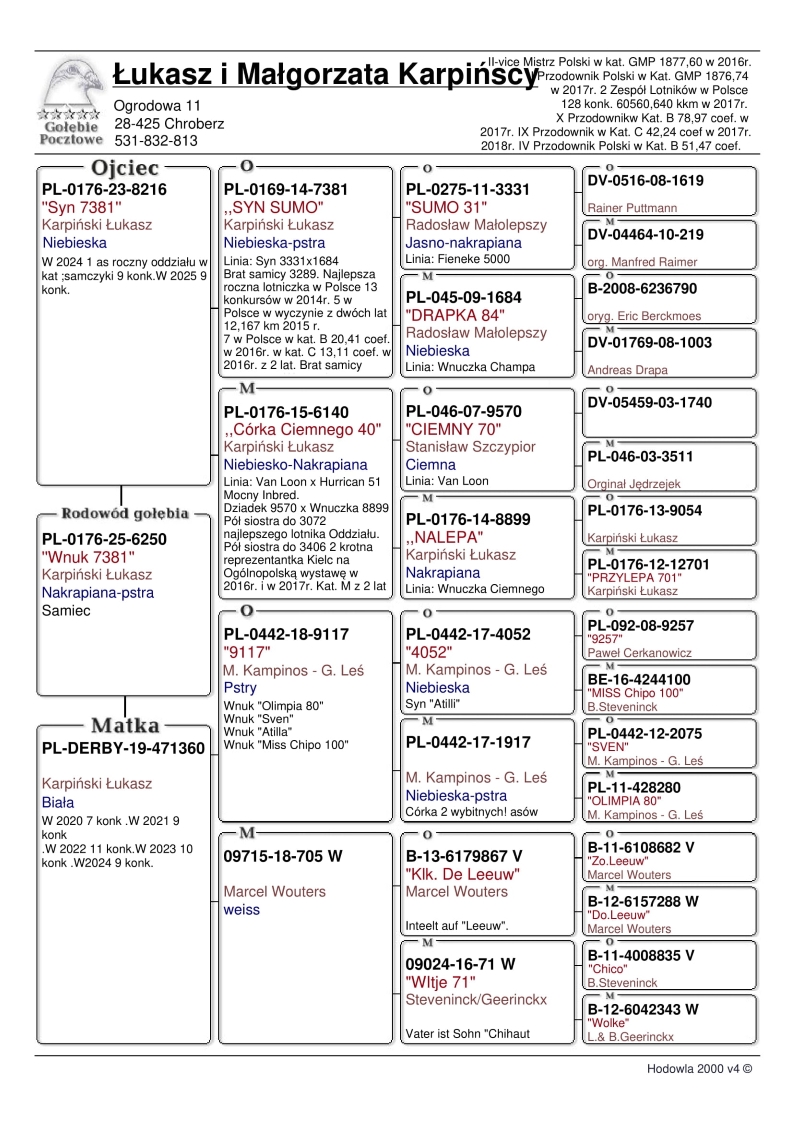 Hodowla z Oddziału 0176 Pińczów, która oparta jest na dwóch BAZOWYCH parach rozpłodowych: Para nr 1 - “CIEMNY 9570 x HURRICANKA 10650” Para nr 2 - “SUMO 3331 x DRAPKA 1684” Do każdego gołębia…