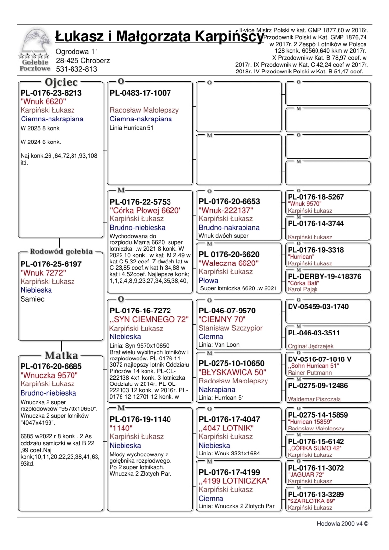 SYN SUPER LOTNICZKI “6685” (WNUCZKA ‘CIEMNY 9570’) - 2 AS SAMICA ODDZIAŁU KAT. B 2022 | SYN DOBREGO LOTNIKA “8213” - W SEZONIE 2025 (8 KONK.) - JEST WNUKIEM SUPER LOTNICZKI “PŁOWA 6620” | WNUK SUPER SAMCA ROZPŁODOWEGO “7272” (SYN ROZPŁODOWCA NR 1 “CIEMNY 9570” !!) | WNUK SAMICY ROZPŁODOWEJ “5753” (CÓRKA “PŁOWEJ 6620” - M.IN.: 1, 1, 2, 4, 8, 9..) | WNUK SAMICY ROZPŁODOWEJ “1140” - LINIA DWÓCH BAZOWYCH PAR HODOWLI / CÓRKA DWÓCH SUPER LOTNIKÓW “4047 X 4199” !!