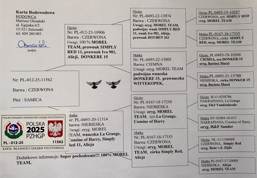 100% MOREL TEAM | CÓRKA SAMCA ROZPŁODOWEGO “11472” ORG. MOREL TEAM - WNUK WSPANIAŁEJ LOTNICZKI “PANAMERA” - 2 AS POLSKI KAT. SPORT G !! | CÓRKA SAMICY ROZPŁODOWEJ “10940” → WNUCZKA “CHICAGO” (OSTATNI SYN WYBITNEGO ROZPŁODOWCA ‘HOUBEN 262’ !!) | WNUCZKA SAMCA ROZPŁODOWEGO “4850” ORG. DARIUSZ BONCZE …
