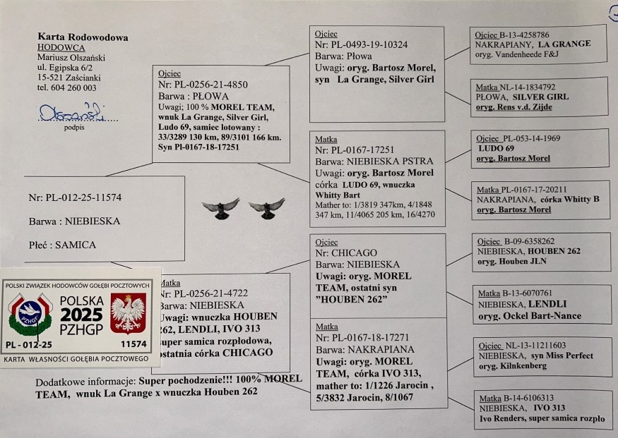 100% MOREL TEAM | CÓRKA SAMCA ROZPŁODOWEGO “11472” ORG. MOREL TEAM - WNUK WSPANIAŁEJ LOTNICZKI “PANAMERA” - 2 AS POLSKI KAT. SPORT G !! | CÓRKA SAMICY ROZPŁODOWEJ “10940” → WNUCZKA “CHICAGO” (OSTATNI SYN WYBITNEGO ROZPŁODOWCA ‘HOUBEN 262’ !!) | WNUCZKA SAMCA ROZPŁODOWEGO “4850” ORG. DARIUSZ BONCZE …