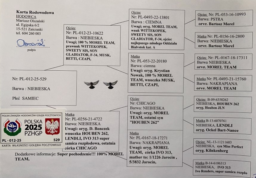100% MOREL TEAM | CÓRKA SAMCA ROZPŁODOWEGO “11472” ORG. MOREL TEAM - WNUK WSPANIAŁEJ LOTNICZKI “PANAMERA” - 2 AS POLSKI KAT. SPORT G !! | CÓRKA SAMICY ROZPŁODOWEJ “10940” → WNUCZKA “CHICAGO” (OSTATNI SYN WYBITNEGO ROZPŁODOWCA ‘HOUBEN 262’ !!) | WNUCZKA SAMCA ROZPŁODOWEGO “4850” ORG. DARIUSZ BONCZE …