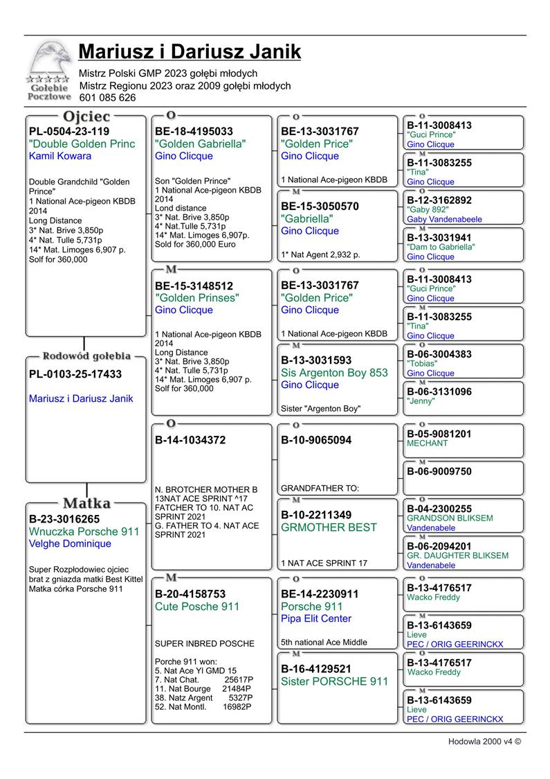 MŁODY LOTNIK 17433 | SYN SAMICY ROZPŁODOWEJ “3016265” - WNUCZKA SŁYNNEGO “PORSCHE 911” PIPA ELITE CENTER | SYN SAMCA ROZPŁODOWEGO “119” - 100% GINO CLIQUE → MOCNY INBRED “GOLDEN PRINCE” (SYN X CÓRKA) - 1 NATIONAL ACE PIGEON KBDB 2014 LONG DISTANCE | WNUK SAMICY “CUTE PORSCHE 911” - INBRED/CÓRKA SŁYNNEGO "PORSCHE 911' W PAROWANIU NA JEGO SIOSTRE !!