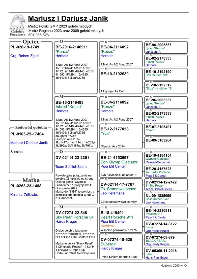 MŁODY LOTNIK 17404 | WNUK SAMCZYKA “KENZO 911” GEBR. HERBOTS (SYN ‘KENZO 092’ X OLIMPIJKA 630 - KAT. SPORT H !!) | SYN SAMCA ROZPŁODOWEGO “1749” ORG. ROBERT ZGUD - MOCNY INBRED SUPER LOTNIKA “KENZO” GEBR. HEROBTS - SYN X CÓRKA !! | SYN SAMICY ROZPŁODOWEJ “1488” ORG. KOSTORZ & ŻÓŁKIEWICZ → WNUCZKA “PEARL PORSCHE 911” (SYN PORSCHE 911 X LUCIA !!)