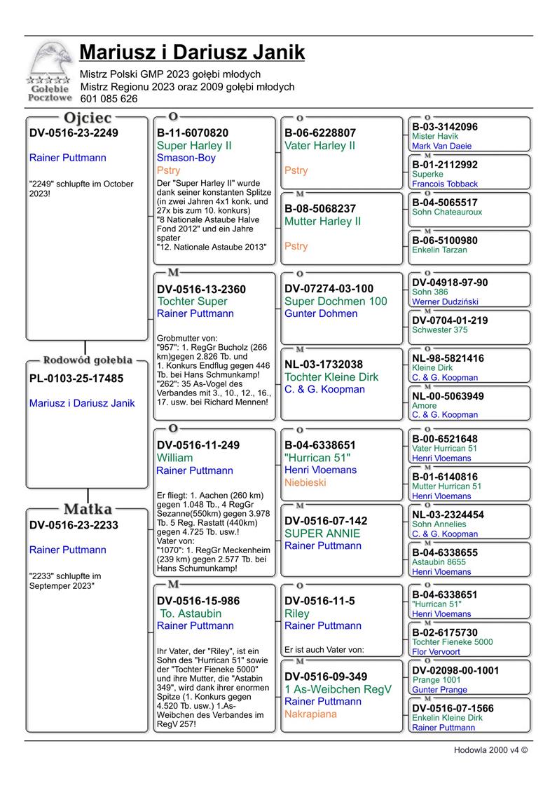 MŁODY LOTNIK 17485 | 100% RAINER PUTTMANN / WNUK “SUPER HARLEY II” - 8 NATIONALE ASTAUBE HALVE FOND 2012 (12 NATIONALE ASTAUBE 2013) | WNUK SAMICY ROZPŁODOWEJ “2360” R. PUTTMANN - CÓRKA “SUPER DOHMEN 100” / WNUCZKA “KLEINE DIRK” C. & G. KOOPMAN | WNUK SAMCA “WILLIAM 249” R. PUTTMANN - SYN “HURRICAN 51 X SUPER ANNIE" | WNUCZKA SAMICY “986” ORG. R. PUTTMANN - JEST ONA CÓRKĄ SUPER LOTNICZKI “349”