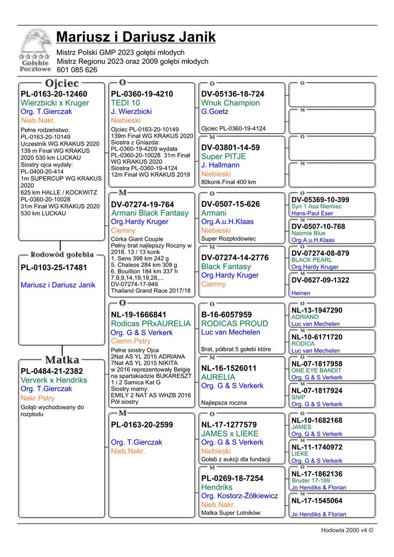 MŁODY LOTNIK 17466 | WNUK ROZPŁODOWCA “1277579” ORG. G. & S. VERKERK - JEST ON SYNEM ‘JAMES X LIEKE’ ! | SYN SAMICY ROZPŁODOWEJ “4890” ORG. TADEUSZ GIERCZAK (VERKERK X HENDRIKS) - JEST ONA RODZENSTWEM M.IN.: 10940 (36 KONK. FINAŁ WG KRAKUS 2019) / 10941 (48 KONK. FINAŁ WG KRAKUS 2019) !! | SYN …