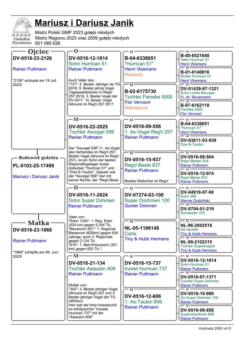 MŁODY LOTNIK 17485 | 100% RAINER PUTTMANN / WNUK “SUPER HARLEY II” - 8 NATIONALE ASTAUBE HALVE FOND 2012 (12 NATIONALE ASTAUBE 2013) | WNUK SAMICY ROZPŁODOWEJ “2360” R. PUTTMANN - CÓRKA “SUPER DOHMEN 100” / WNUCZKA “KLEINE DIRK” C. & G. KOOPMAN | WNUK SAMCA “WILLIAM 249” R. PUTTMANN - SYN “HUR …