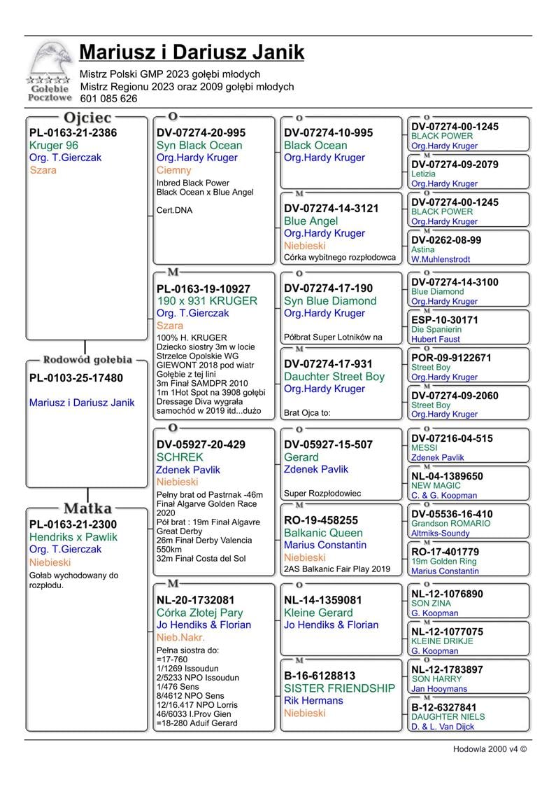 MŁODA LOTNICZKA 17480 | CÓRKA ROZPŁODOWCA “2386” ORG. TADEUSZ GIERCZAK (100% HARDY KRUGER) | WNUCZKA ROZPŁODOWCA “995” HARDY KRUGER (SYN BLACK OCEAN X BLUE ANGEL) - MOCNY INBRED “BLACK POWER” - SYN X CÓRKA !! | CÓRKA SAMICY ROZPŁODOWEJ “2300” ORG. T. GIERCZAK (HENDRIKS X PAWLIK) | WNUCZKA “SHREK 429” ORG. ZDENEK PAWLIK - PEŁNY BRAT “PASTRNAK” (46 MIEJSCE FINAŁ ALGARVE GOLDEN RACE 2020)