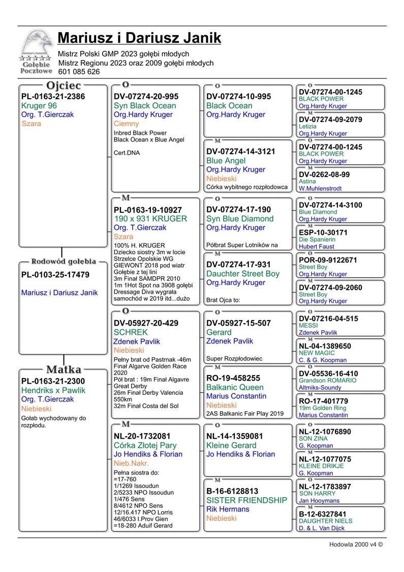 MŁODA LOTNICZKA 17479 | CÓRKA ROZPŁODOWCA “2386” ORG. TADEUSZ GIERCZAK (100% HARDY KRUGER) | WNUCZKA ROZPŁODOWCA “995” HARDY KRUGER (SYN BLACK OCEAN X BLUE ANGEL) - MOCNY INBRED “BLACK POWER” - SYN X CÓRKA !! | CÓRKA SAMICY ROZPŁODOWEJ “2300” ORG. T. GIERCZAK (HENDRIKS X PAWLIK) | WNUCZKA “SHREK 429” ORG. ZDENEK PAWLIK - PEŁNY BRAT “PASTRNAK” (46 MIEJSCE FINAŁ ALGARVE GOLDEN RACE 2020)