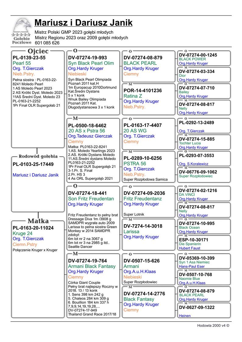 MŁODY LOTNIK 17421 - 100% TADEUSZ GIERCZAK | SYN SAMCA ROZPŁODOWEGO “2385” ORG. T. GIERCZAK (KRUGER X KOKARTIS) - WNUK OLIMPIJCZYKA “BLACK PEARL” HARDY KRUGER | WNUK SAMICY ROZPŁODOWEJ “10681” ORG. T. GIERCZAK - WNUCZKA “ARAMNI” A.u.H. KLAAS | SYN SAMICY ROZPŁODOWEJ “300” ORG. T. GIERCZAK - …