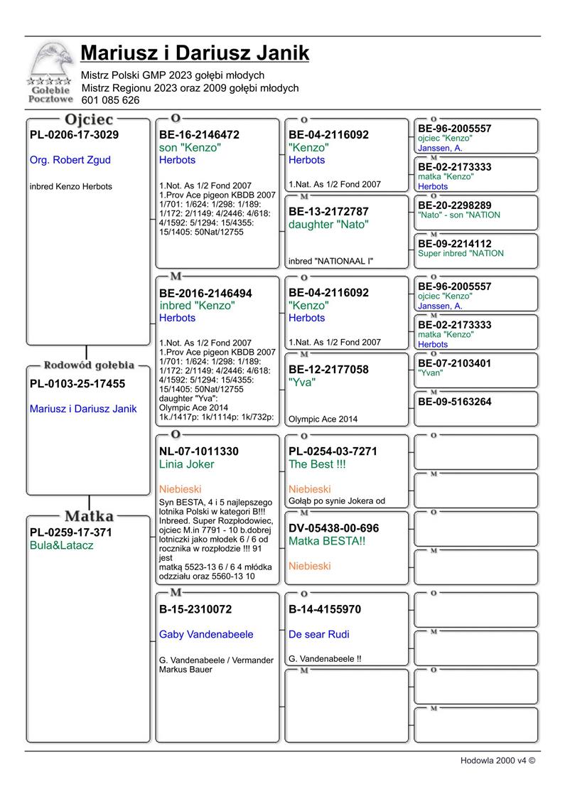 MŁODY LOTNIK 17404 | WNUK SAMCZYKA “KENZO 911” GEBR. HERBOTS (SYN ‘KENZO 092’ X OLIMPIJKA 630 - KAT. SPORT H !!) | SYN SAMCA ROZPŁODOWEGO “1749” ORG. ROBERT ZGUD - MOCNY INBRED SUPER LOTNIKA “KENZO” GEBR. HEROBTS - SYN X CÓRKA !! | SYN SAMICY ROZPŁODOWEJ “1488” ORG. KOSTORZ & ŻÓŁKIEWICZ → WNUC …