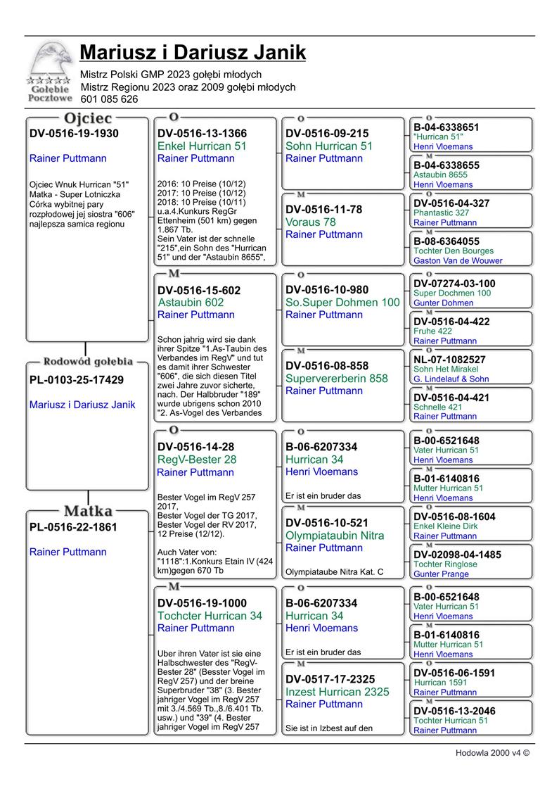 MŁODY LOTNIK 17416 | WYHODOWANY W POKREWIEŃSTWIE SŁYNNEGO “HURRICAN 51” HENRI VLOEMANS | SYN SAMICY ROZPŁODOWEJ “680” ORG. MARCIN SOBCZAK → INBRED “HURRICAN 51” | WNUK ROZPŁODOWCA “2213” R. PUTTMANN - INBRED “HURRICAN 51” (BRAT X CÓRKA) | SYN ROZPŁODOWCA “2553” HORS BELLINGER - JEST ON WNUKIEM “HU …