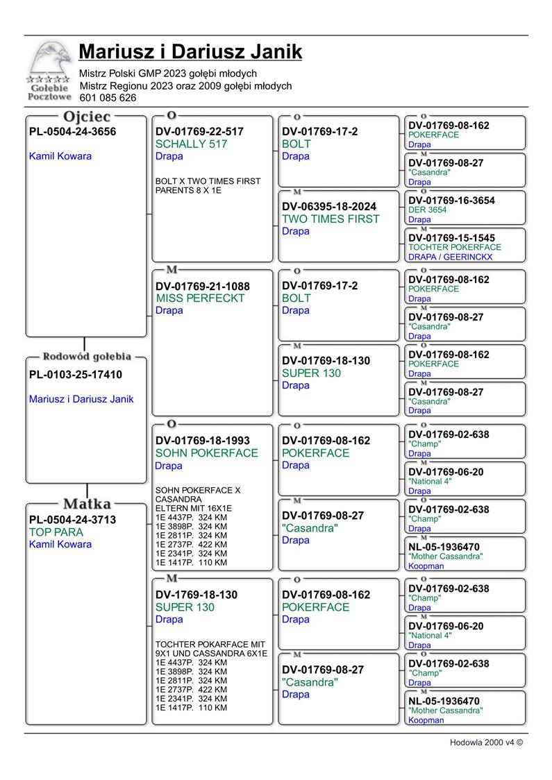 MŁODA LOTNICZKA 17412 | CÓRKA SAMICY ROZPŁODOWEJ “186” - 100% ANDREAS DRAPA - MOCNY INBRED “POKERFACE X CASSANDRA” (PAROWANIE DWÓCH ICH DZIECI) / POKERFACE - 9 X 1 KONK. / CASSANDRA - 6 X 1 KONK. (OBOJE TO DZIECI ‘CHAMPA’ !!) | CÓRKA SAMCA ROZPŁODOWEGO “KRUGER 998” ORG. TADEUSZ GIERCZAK → WNUK “BL …